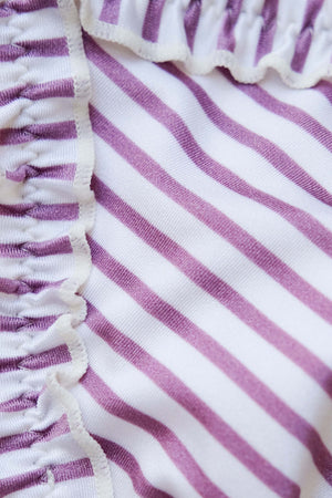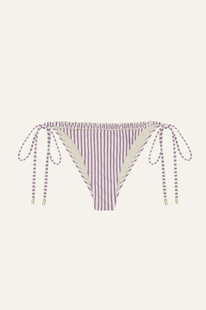 A refined silhouette, refreshed with playful ruffles for a holiday state of mind. The Essential String Pant comes to life in a timeless Mauve and cream stripe, finished with premium golden toggles and tie sides for the perfect fit.