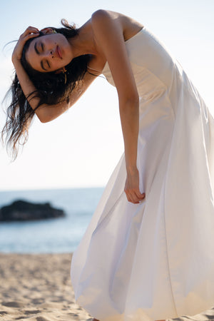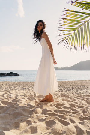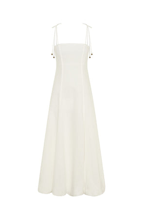 The Sylvie Maxi Dress features a bubble hem, subtle piping details, complete with delicate adjustable shoulder straps.