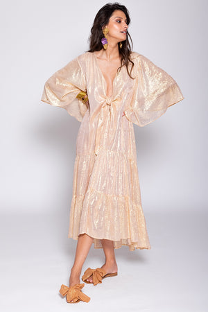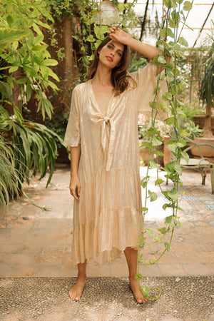 If you’re looking for some after sun shimmer, this is the one for you. An extremely flattering silhouette which suits all shapes, with billowing kimono sleeves and front knot detail. This fit is generous, so you will feel comfortable and flowing.