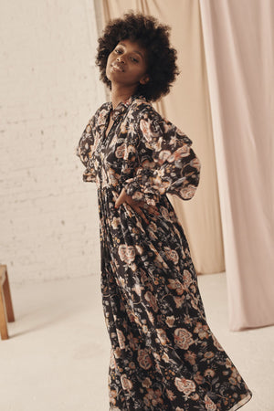 This utmost bohemian dress is made of 100% silk veil. Its voluminous sleeves and loose fit leave a bohemian perfume behind as you walk by.