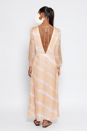 Realized in a beige and white tie and dye fabric, Chicka features a plunging V neckline and a deeper neckline on the back that can be adjusted thanks to links. For more volume, sleeves are tightened by an elastic at the cuffs. Slit's on each side at the bottom of the dress prettily discloses your legs.