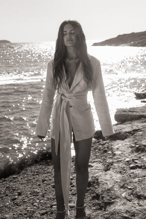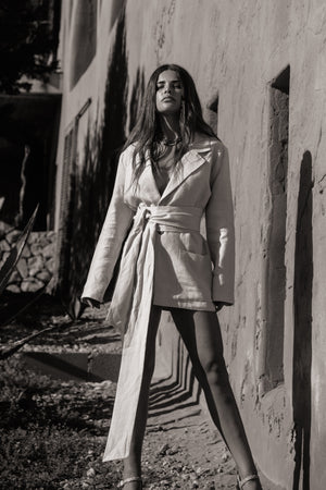 The women’s linen blazer is a relaxed, generous fit, to allow you to wear elegantly wrapped with the sash belt, or loose as a more oversized fit. If you prefer a more structured fitted look, we would suggest to size down.