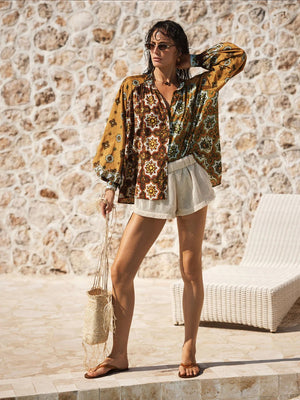 Alhambra recalls the intricate rhythm of sun-warmed tiles, its dense patchwork of retro browns, reds and mustard enlivening breezy Lenzing cottons.