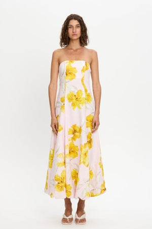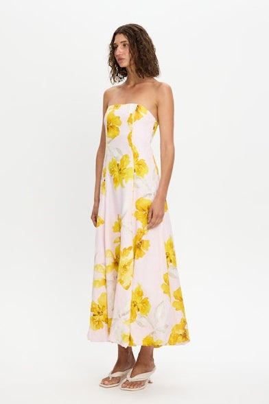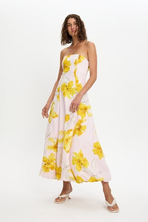 The Francine Strapless Maxi Dress features a strapless fitted bodice, flared skirt, bubble hem and complete with subtle corded piping detail throughout. Sculptural yet effortless, it’s a statement silhouette designed to move with ease. Style with flat sandals for a relaxed daytime look, or elevate with heels for long lunches and summer occasions.