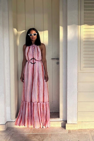 Loosely-fitted maxi dress with a low V-neck front. Featuring ruffle details and a tie-able neckline, for a fuller coverage. Sustainably crafted with 100% FSC Georgette Viscose.