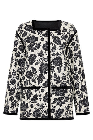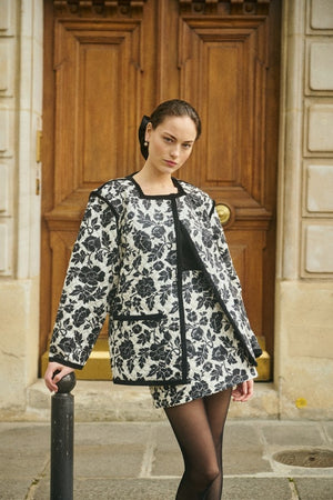 Adorned with an exclusive, vintage-inspired POSSE print, the Romeo Jacket is finished with quilted stitching and traced with cotton velvet trims. Designed for an oversized, boxy fit, it features a high neckline, long sleeves and usable front pockets. It's reversible design allows for it to be worn both ways, proving it's versatility. Coordinate yours with the matching Romeo Mini Skirt.
