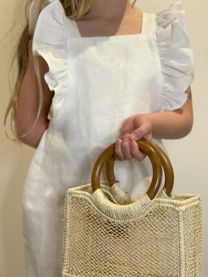 Woven with a minimalist design of fine straw fibres and 100% recovered wood handles, this is the mini version of the stunning Aurelia bag. The unique design is an elegant addition to any outfit, either for you to opt for a smaller bag for evenings or for your little ones to share a twin moment.