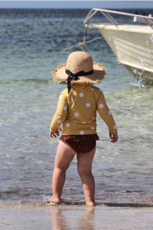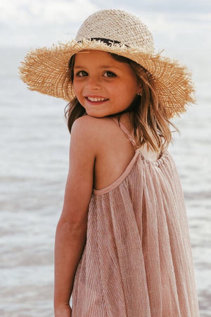 This Barbados straw hat is a mini version of the adult hat. Made in beautiful soft straw with raw cut edge and slim black ribbon. The perfect hat to give shade on those sunny days.