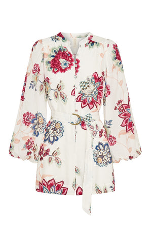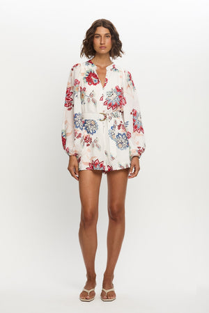 Provence is intricate red and blue florals on a soft white base. The Provence Playsuit is a relaxed silhouette featuring a button down front, full length blouson sleeves, complete with a signature D-ring belt.