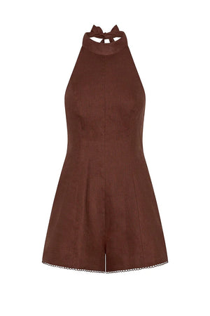 The Maxine Playsuit is designed with a high neckline and elongated ties that frame an open, low back. Featuring A-line shorts and delicate lace detailing along the hem, it blends ease and femininity in equal measure — a timeless style made for sunlit days.