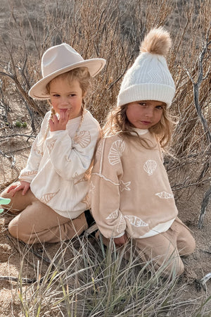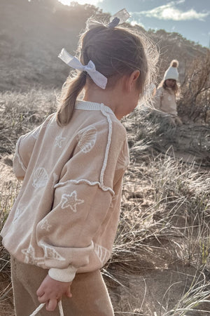 WE LOVE THE BEACH! A 100% cotton knit in our most loved shoreline print to keep little ones cosy and warm during those cool summer evenings.