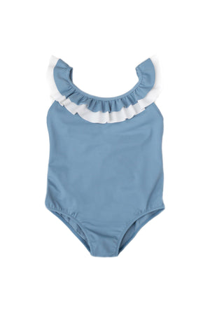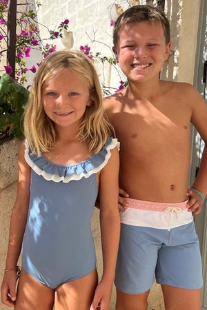 Timeless and romantic, the adorable Penelope swimsuit in Dusty Blue and Ivory is every little girls dream. The delicate front and back pleats create a beautiful and intricate movement, flaunting the attention to detail.