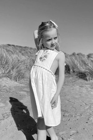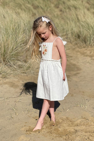 The Folk Apron refers to a dungaree dress in it’s look. It has delicate tasselled cord spaghetti straps, which can be adjusted in length. The top shows this seasons embroidery. It has a straight embroidered waistline which has an elasticated back for an easy fit.