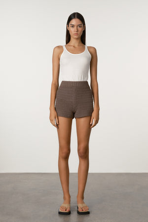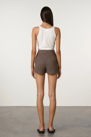 A crochet-style knit crafted from soft, mid-weight cotton yarn in a rich carob hue. Designed with a relaxed, oversized silhouette, featuring a boat neckline and long sleeves. Perfect as a breezy mini dress or layered as a lightweight jumper over your bikini. Wear with the matching Carob Lattice Knit Jumper to complete a full outfit.