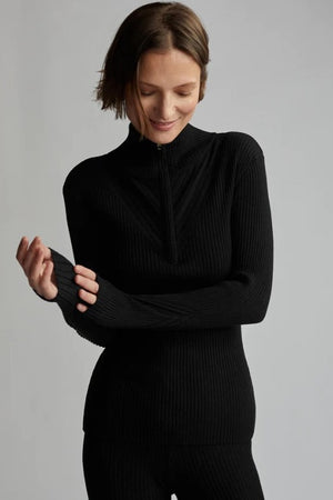 Introducing the Demi half-zip knit, a luxurious base layer designed to keep you warm in style. This knitted top boasts a half-zip design with placement rib detailing for a contemporary finish. Made from plush viscose yarn in a fine wide rib, it’s perfect for layering under heavy sweaters and outerwear during cold winter days, whether you're in the mountains or the city.