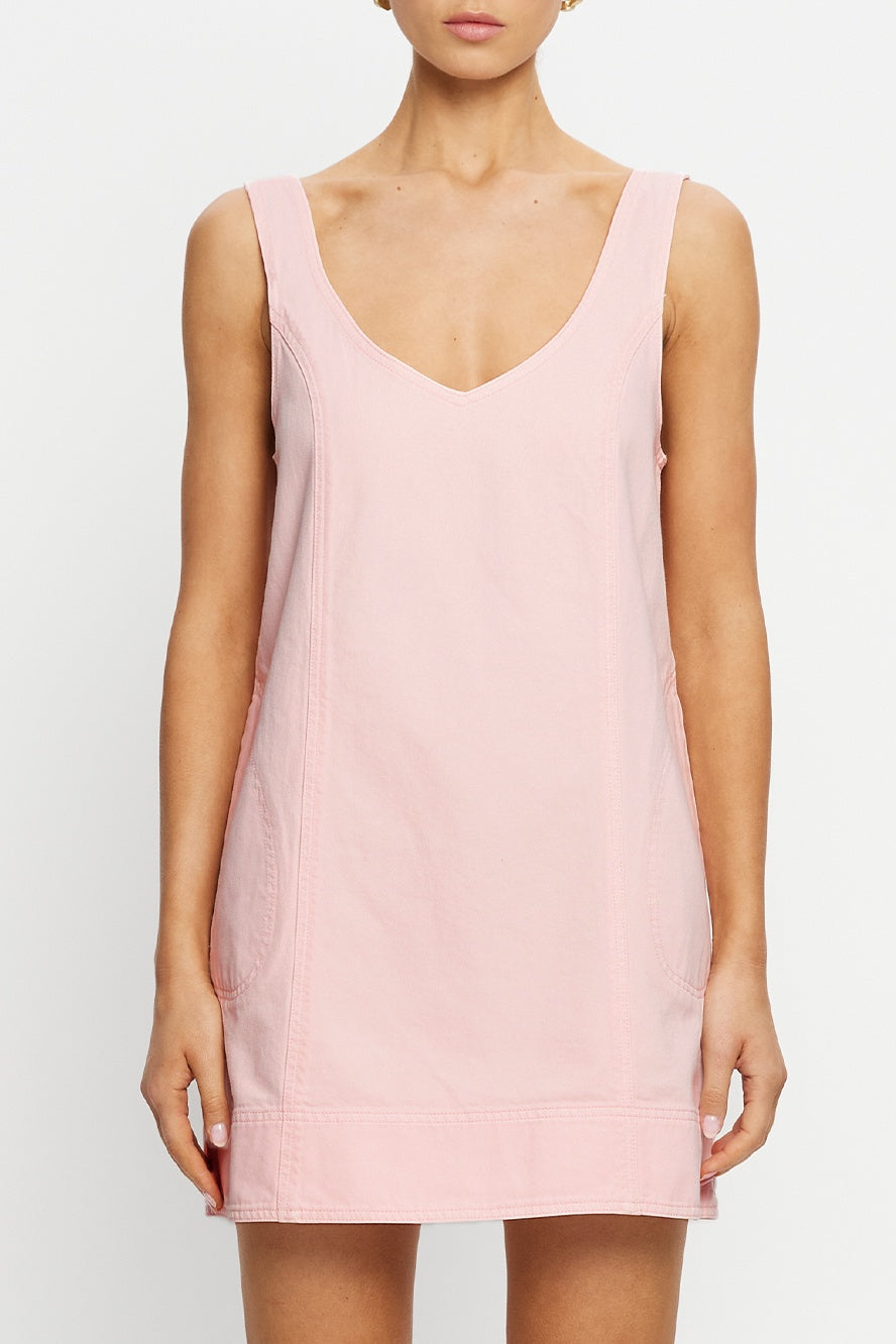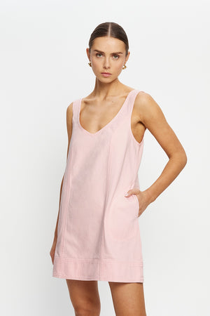 The Ilaria Denim Mini Dress is a relaxed shift silhouette, crafted in a pink colourway. Featuring contrast topstitch detailing, panel seams and front pockets, this effortless style combines laid-back ease with elevated detailing. Elevate with heeled sandals for warm evenings or long lunches in the sun.