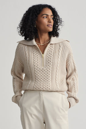 This pullover is made from a luxurious wool-blend with a placement cable design and signature oversized collar. Perfect for any occasion, it promises both warmth and style.