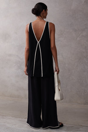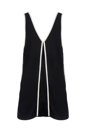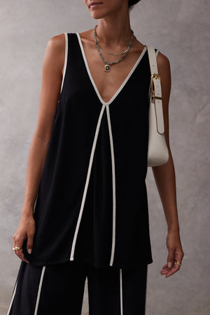 The Esila is a tunic style top that exudes quiet luxury. Featuring a deep v-neckline and box pleat at the front and back with a contrast piping, this tunic is a dream for those seeking a floaty yet sophisticated top. Pair with the Vera Pants and ballet style flats for an elevated chic look or a long slim skirt.