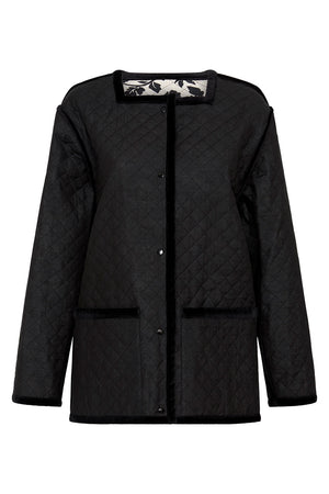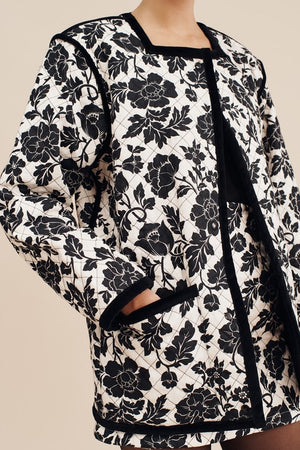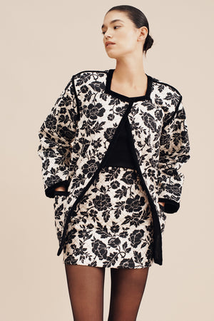 Adorned with an exclusive, vintage-inspired POSSE print, the Romeo Jacket is finished with quilted stitching and traced with cotton velvet trims. Designed for an oversized, boxy fit, it features a high neckline, long sleeves and usable front pockets. It's reversible design allows for it to be worn both ways, proving it's versatility. Coordinate yours with the matching Romeo Mini Skirt.