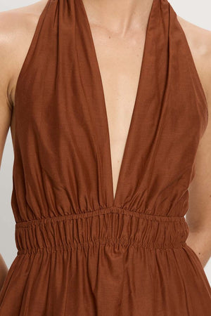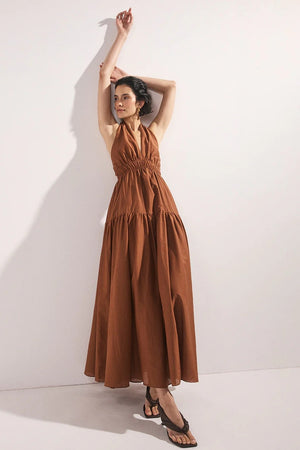 The Anouk Maxi Dress is crafted from a soft cotton-silk blend, featuring a halter V-neckline with elongated ties that be styled and crossed multiple ways and an elasticated waistband for subtle shape. Falling to a tiered, gathered skirt, it drapes with ease — a timeless silhouette that moves with you. Style with strappy sandals for sun-soaked lunches or pair with a heel for evening celebrations.