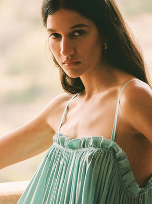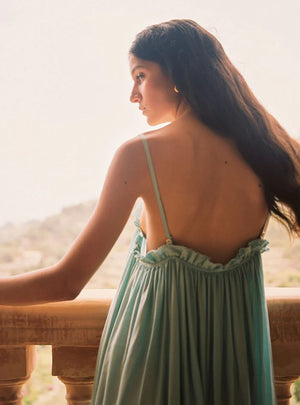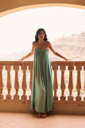 A showstopping sundown dress. Peony's Gathered Maxi Dress in Mint is lightweight and easy wearing for any location or occasion. With fine shoulder straps, softly ruffled neckline and endless volume, this dress requires minimal styling. Just add chic sandals to take you from from alfresco dining to special occasions alike.