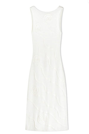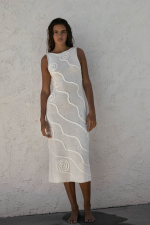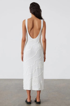 The Shea Organic Cotton Swirl Knit Dress is crafted from a soft mid-weight blend of cotton and nylon, offering a comfortable yet elevated feel. Featuring a striking jacquard swirl pattern, this dress has a high neckline at the front that contrasts with its alluring low-back design. The relaxed silhouette makes it perfect for easy, elegant resort wear styling.