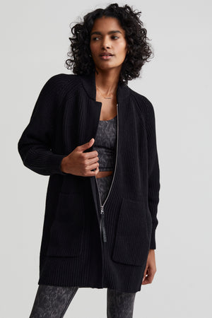 Produced in a flecked and chunky cotton rib knit with fashioned raglan sleeves, this loose-fitting, longline jacket offers great coverage. This style has a varsity collar, patch pockets and zips up the front.