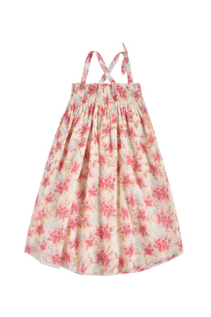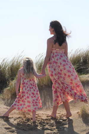 This long colourful summer dress matches the mama version in the beautiful Raspberry Flowers print and handcrafted smocking detail. With elegant cross back, adjustable straps, this can be adjusted for the perfect fit for your growing little one. Fully lined.