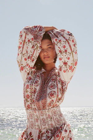 Long sleeve Maxi dress in our Signature Smock style.Flattering stretch Shirred waist to hip panel, with soft elastic at waist.Self-covered fabric button & loop front closure to waist
