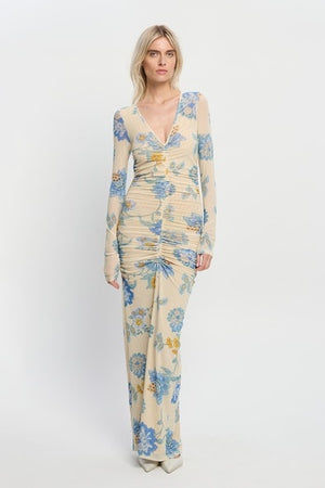 Giselle is intricate blue toned vine florals on a fresh butter base. The Giselle Mesh Maxi Dress features a v-neckline, feminine ruched detailing throughout the body and sleeves, complete with a flared skirt.