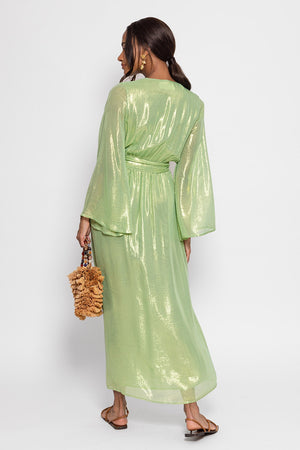 Stunning fixed wrap dress with wide flowing sleeve and deep front split.
