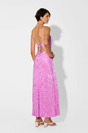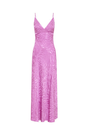 The Stela Slip Dress is crafted from a zebra jacquard fabrication and features a v-neckline and open lace back detail, complete with a bias cut skirt.