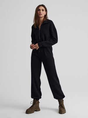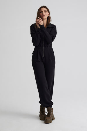 Pull on this statement one-piece for low key lounge days, or dress it up for Fall evenings. Cut in our soft and luxurious double-faced jersey, the Jessie has a relaxed fit with a front zip opening that may be worn up or down. This style features popper fastenings at the cuffs.