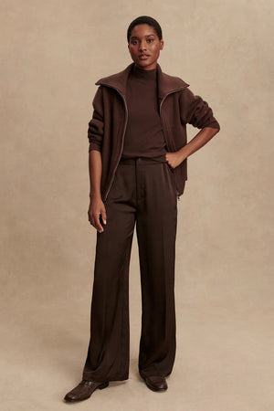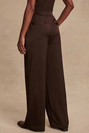 An updated take on our coveted Bryden pants, the Bryden 2.0 are a statement piece that will elevate any look. Crafted from our new, lighter semi-gloss Sateen fabric, its beautiful drape and sheen are further accentuated by elegant front pleats. These wide-leg pants are complete with side pockets, a snap and fly front, and an elasticated waistband for optimal comfort.