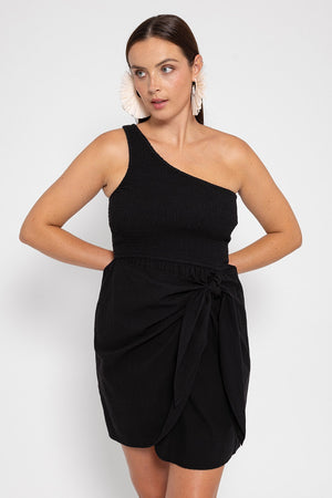 Zuri has an asymmetric bodice entirely made by smocking for a flattering fit. Inspired by pareo styling, the skirt part has two yokes designed to be tied to the side for a draped effect.