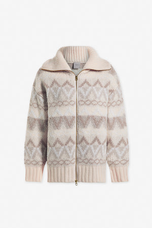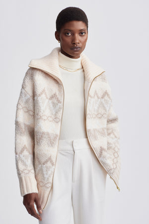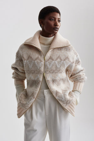Stay stylishly warm in the oversized and plush Brooke Fair Isle jacket, a standout winter layer. Made from a luxurious blend of soft fabric, this oversized winter essential promises both warmth and style. Featuring a larger collar and chunky ribbed trim to fend off the winter chill, the jacket is elevated with a contemporary V monogram Fairisle design.