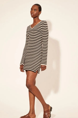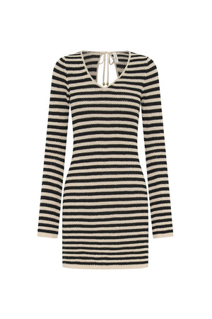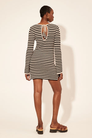 The Anita Mini Dress in an oat and black stripe, featuring a v-neckline, a flared sleeve, keyhole feature at back with tie closure.