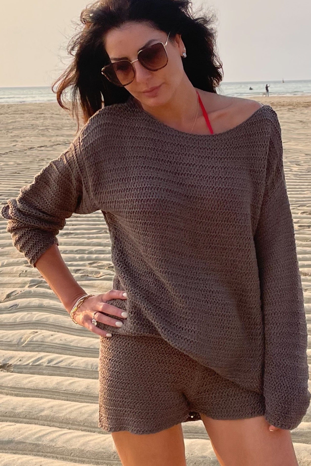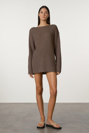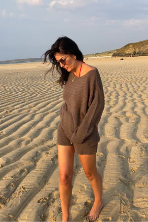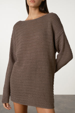 A crochet-style knit crafted from soft, mid-weight cotton yarn in a rich carob hue. Designed with a relaxed, oversized silhouette, featuring a boat neckline and long sleeves. Perfect as a breezy mini dress or layered as a lightweight jumper over your bikini. Wear with the matching Carob Knit Shorts to complete a full outfit.