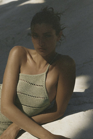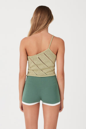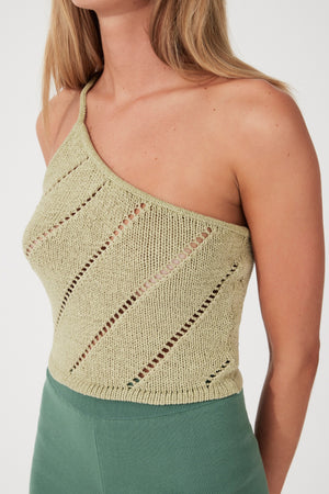 The Olive Lattice Knit Top by Zulu & Zephyr features a one-shouldered strap and waist length, in a soft, luxurious summery knit with diagonal lattice detailing.