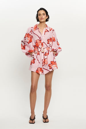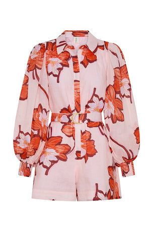 Lani is a floral print featuring hibiscus-inspired blooms in vivid shades of orange and red on a soft pink base. The Lani Playsuit is a relaxed silhouette featuring full-length blouson sleeves and a two-piece shirt collar, finished with a button-through front and removable D-ring belt for adjustable shape. Perfect for coastal getaways, relaxed weekends and sunlit afternoons.