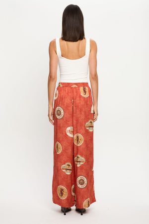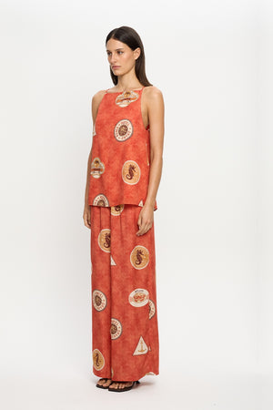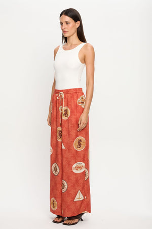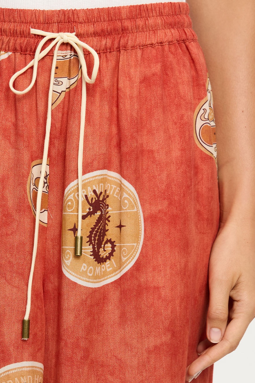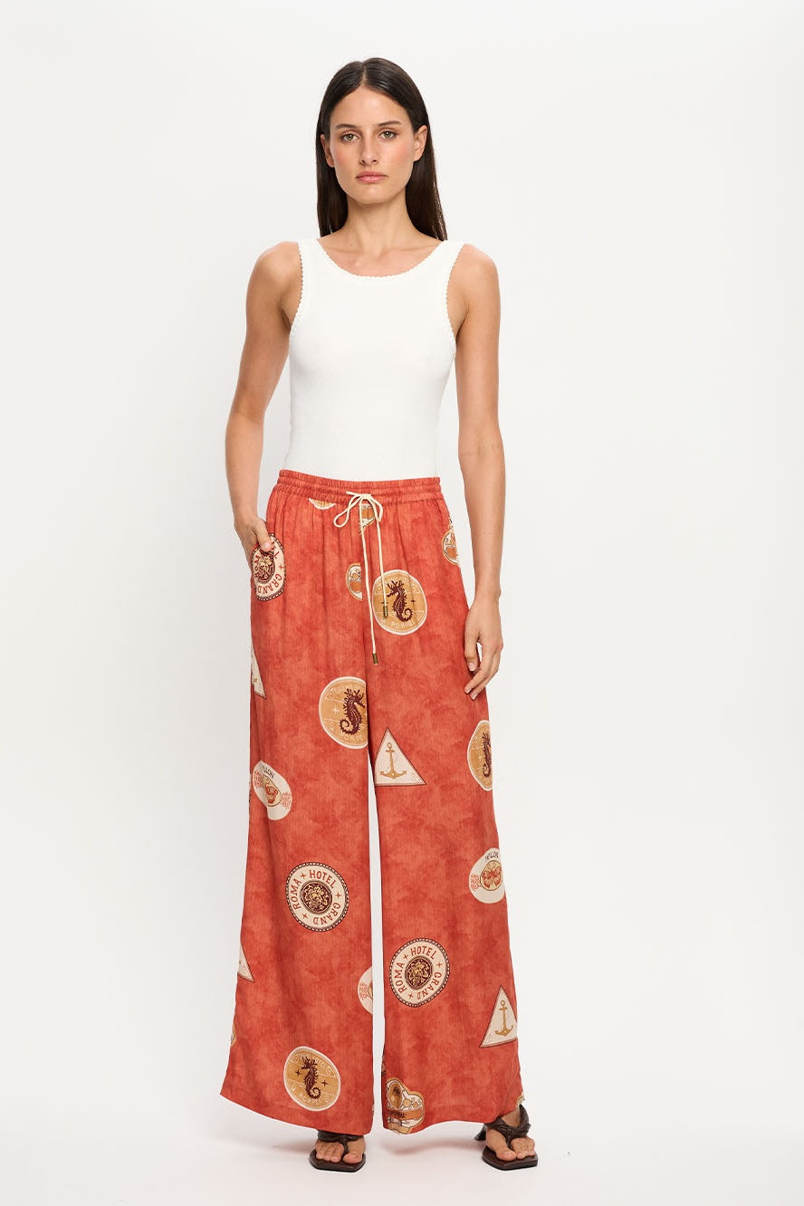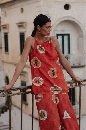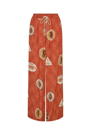 Vacanza is vintage motifs set against a rich, warm red base. The Vacanza Pant is a straight leg pant featuring an elasticated waistband with drawcord, complete with in seam pockets. Wear with the Vacanza Top to complete a co-ord look.