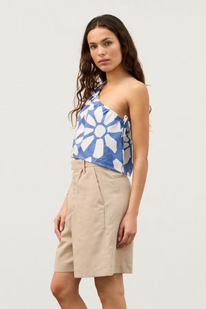 The Geo Flower Cotton Top is crafted from crisp poplin fabric, offering a light and breathable feel. It features a one-shouldered, gathered neckline and adjustable side tie detail. With a relaxed, flowing smock silhouette, its bold, vibrant print adds a pop of style while ensuring comfort all day long. Wear with the Geo Flower Pant to complete the look.