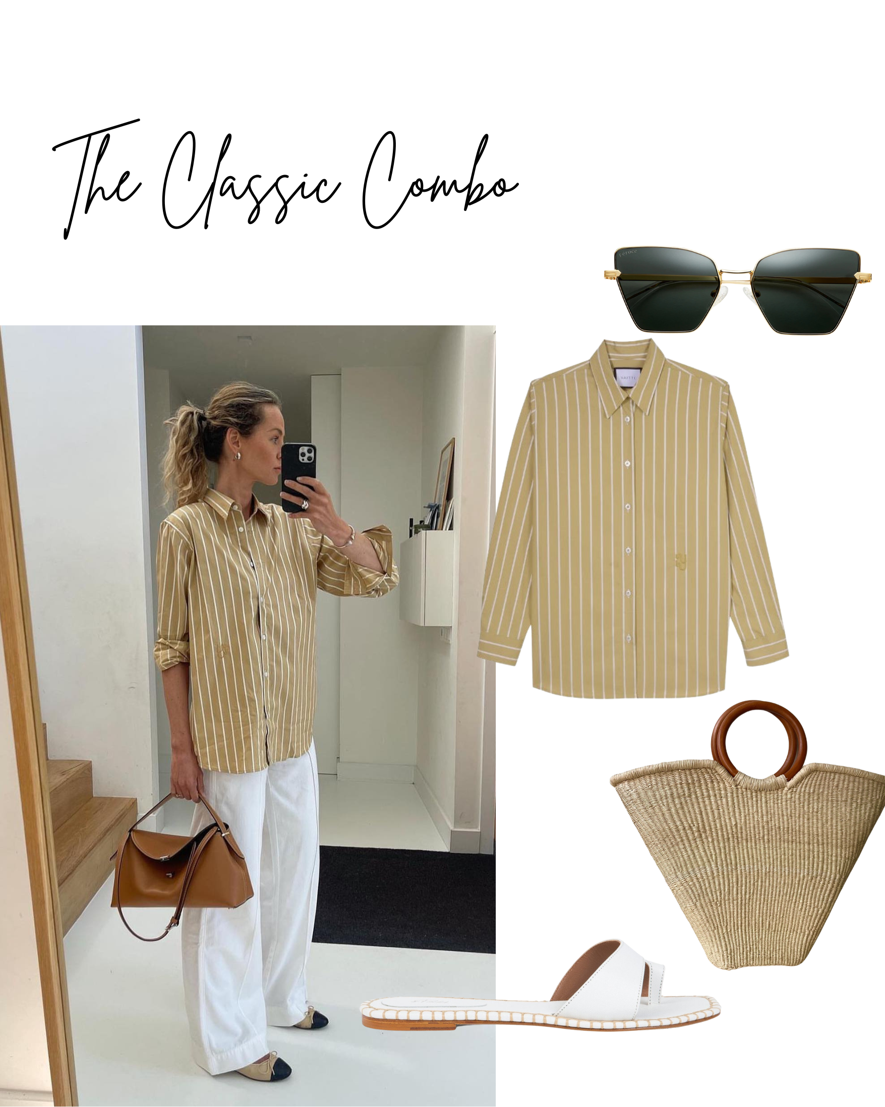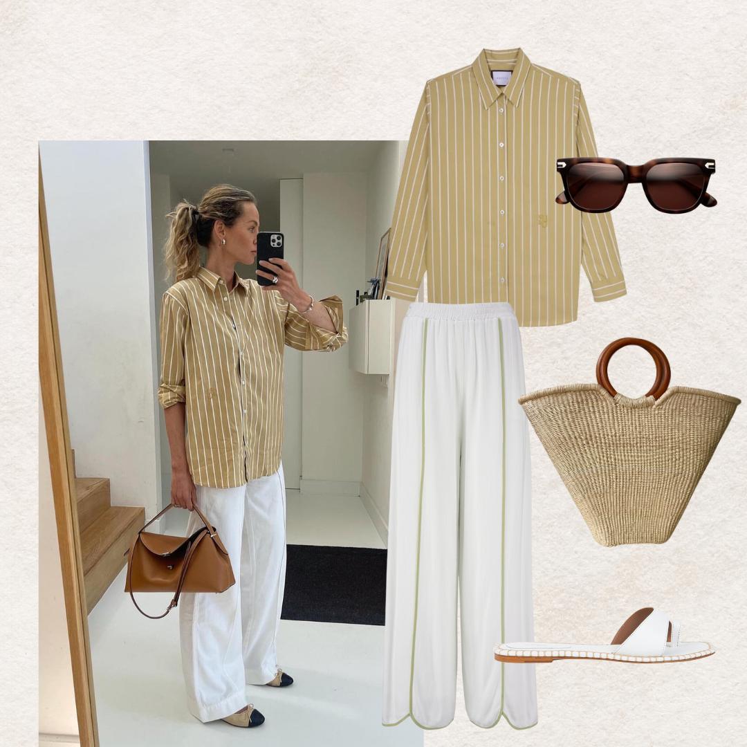 This is an easy way to master a smart, casual look. It's practical, versatile and light. Team the Mustard BUOY Stripe Shirt as seen on @anoukyve, with with the Wesley White Trousers or jeans and relax the look with the Isla Sandals. The colours mirror the stripe and the neutral Vienna Bag to take you from flight to poolside in a second. The perfect combination for laidback chic during your plane journey.