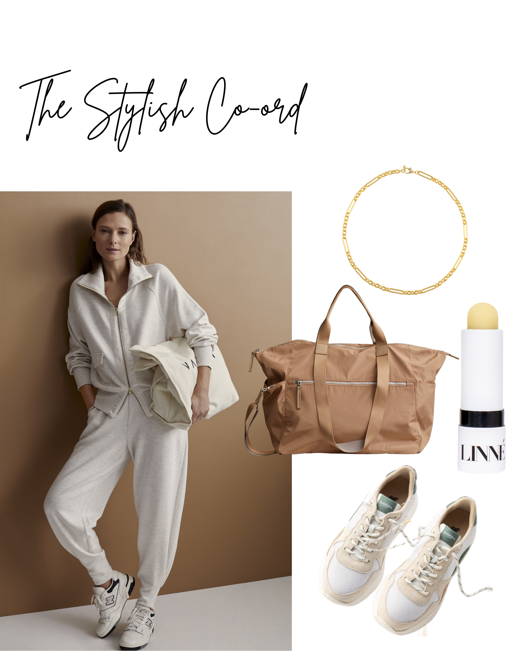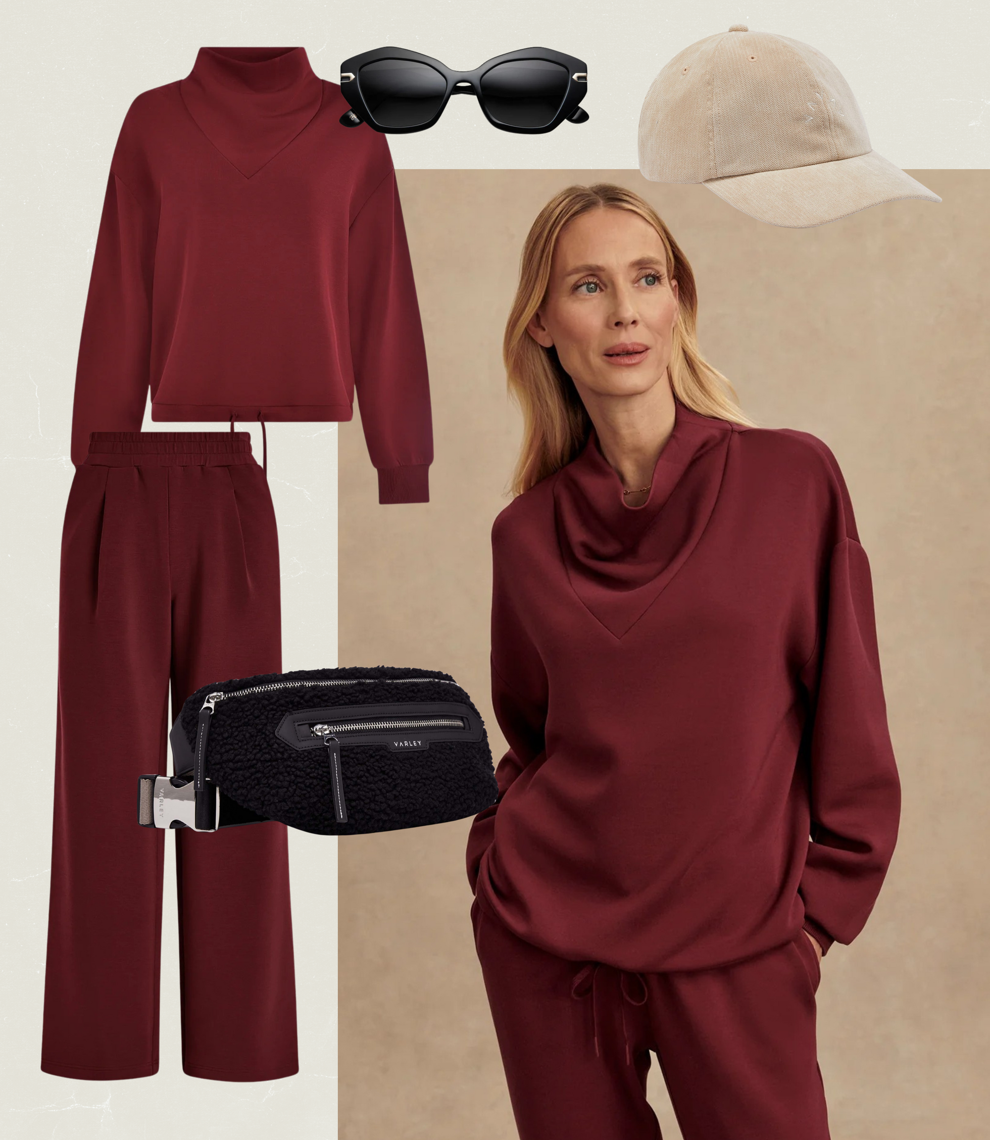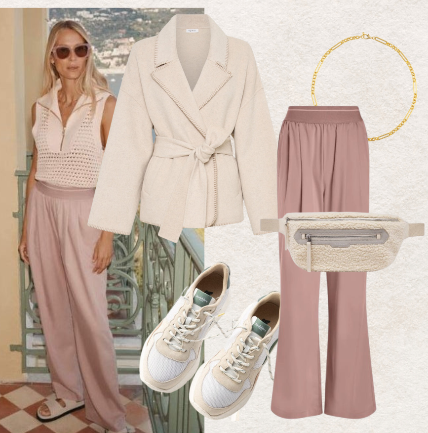For a chic yet comfortable daytime airport look, a stylish tracksuit is the ultimate choice. Opt for a matching set in a chic Berry shade, like the new Betsy Tracksuit from Varley, to exude understated elegance. Pair the look with sleek white sneakers for a modern touch and layer with a longline coat or tailored trench for added sophistication. Complete the look with the chic belt bag to carry travel essentials. This outfit strikes the perfect balance between effortless style and all-day travel comfort.
