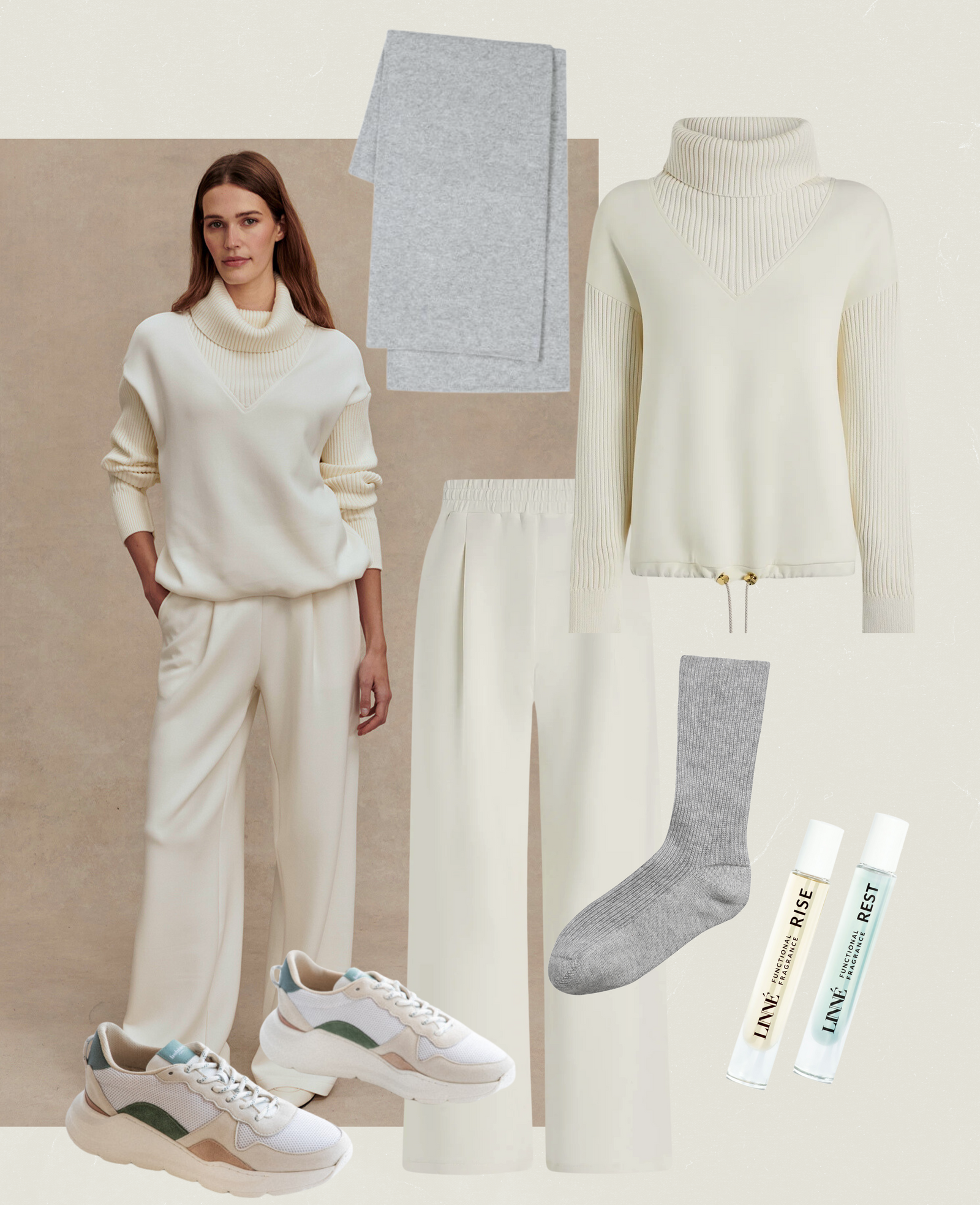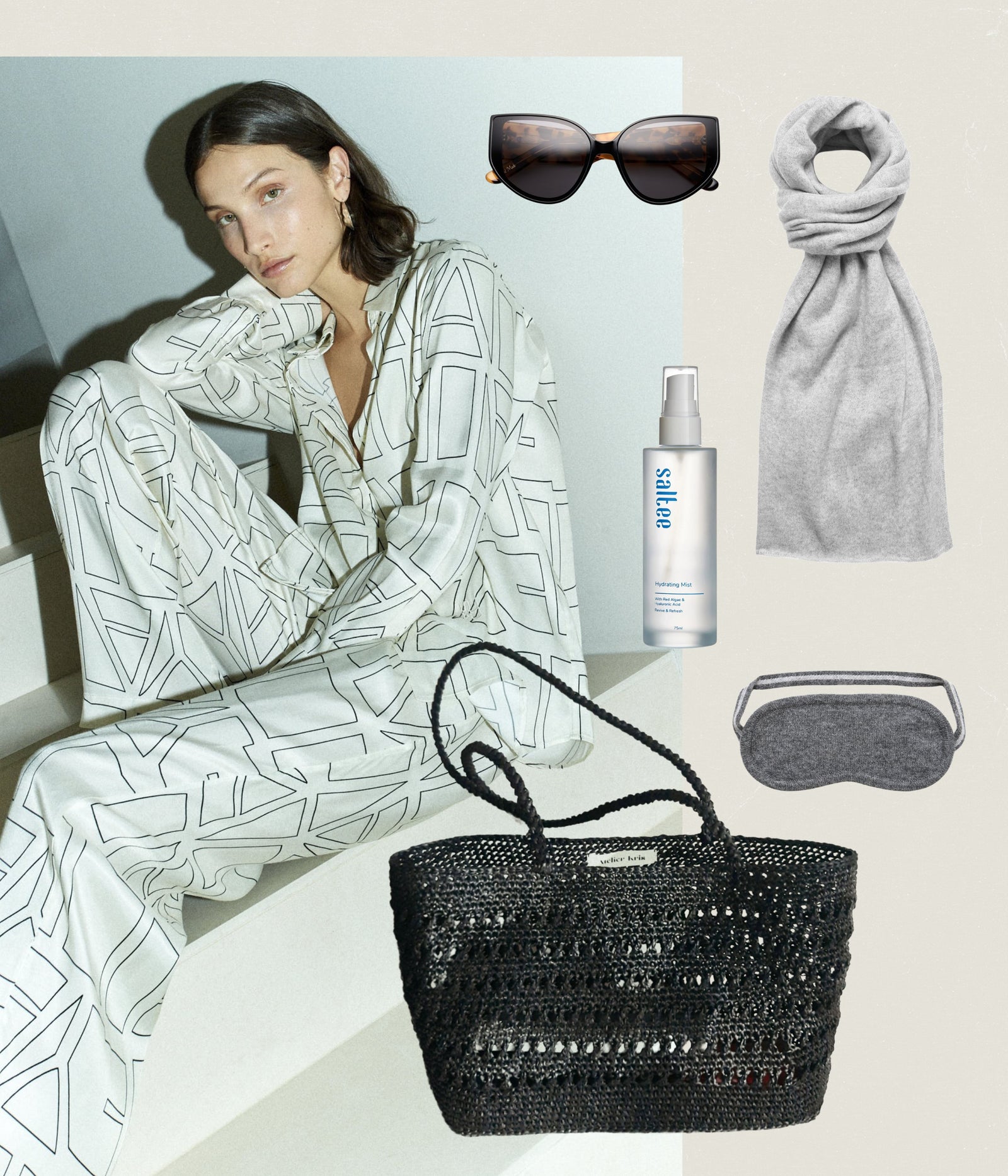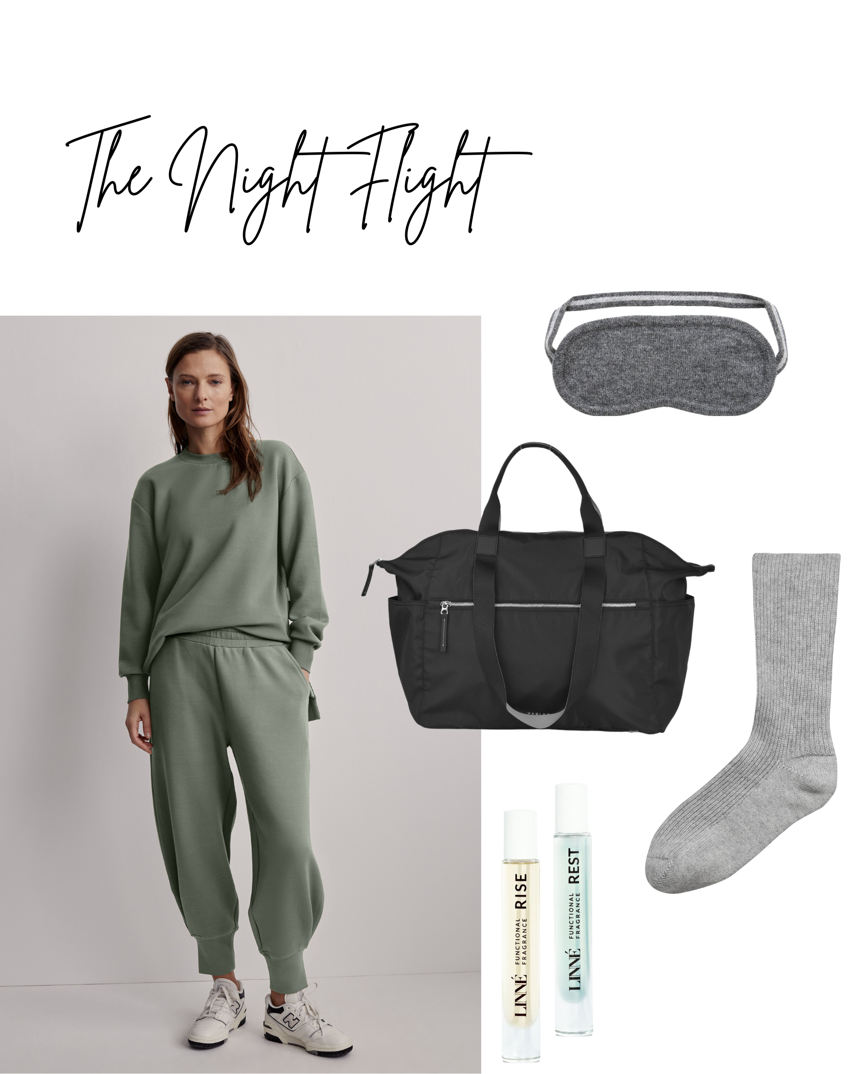 If there's ever a time to cosy up in some sweats, it's on a long haul flight. The Hannah Doublesoft Tracksuit in Egret from Varley gives an ultra-cool look when you need extra soft comfort on the plane. It's even better layered up with a jacket! Add the key 'must-have' accessories for night flight bliss, including the Cashmere eyemask and socks ,and keep your skin hydrated with the Saltee Hydrating Mist.Lastly, ensure a good night sleep with Rest & Rise oils.