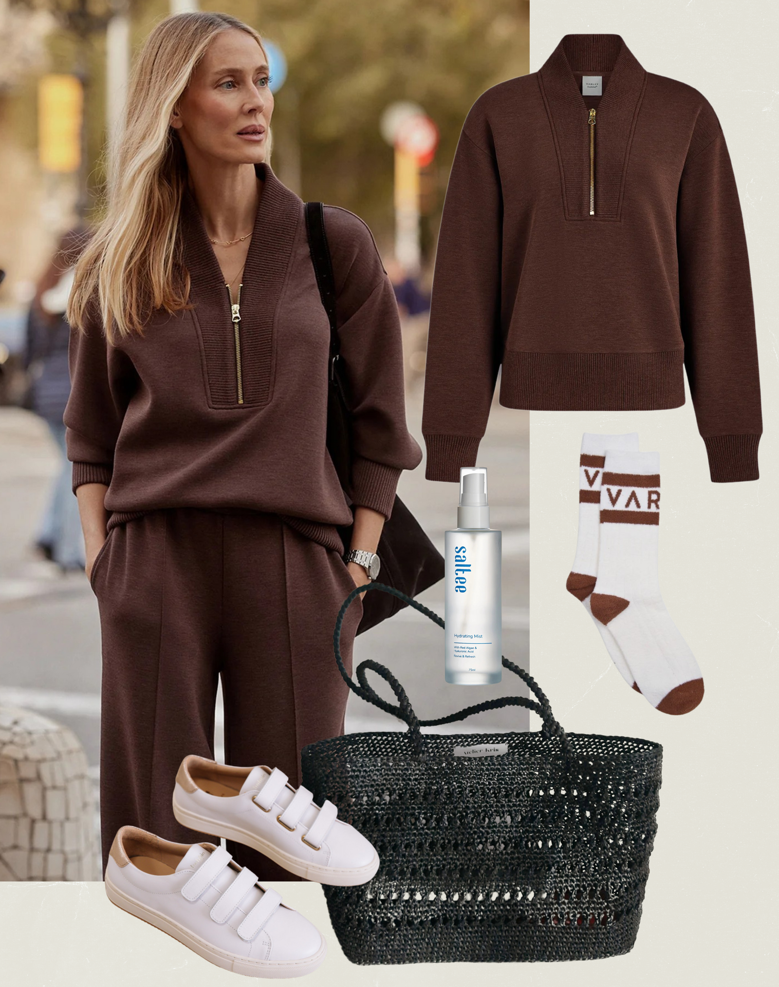 For a chic yet comfortable daytime airport look, a stylish tracksuit is the ultimate choice. Opt for a matching set in a chic Cocoa shade, like the new Sally Half ZipTracksuit from Varley, to exude understated elegance. Pair the look with sleek white sneakers for a modern touch and layer with a longline coat or tailored trench for added sophistication. Complete the look with the chic Renee Crochet Bag to carry travel essentials straight through to your destination. This outfit strikes the perfect balance between effortless style and all-day travel comfort.