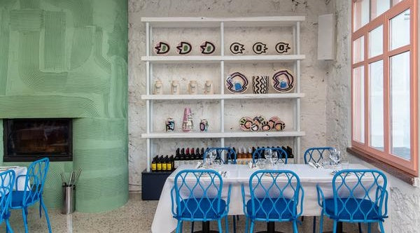 A charming art deco building sitting near the end of the beachfront with its salmon pink doors and windows is the brasserie and artist studio of Alexandra Manousakis.
