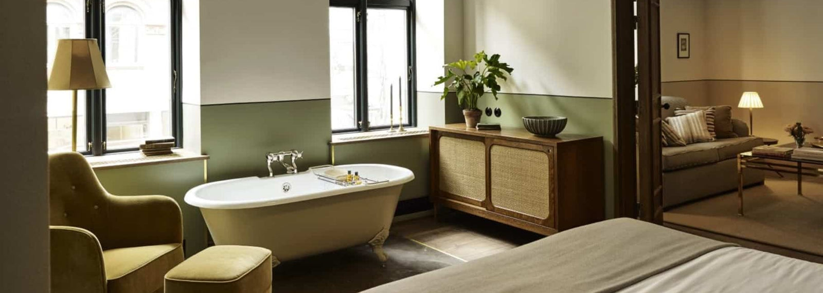 For those who like grandeur with their slow luxury, Villa Copenhagen is housed in the city’s former Grand Central Post Office. While its scale is impressive, the ethos is very much rooted in sustainability and Nordic sensibility. Open since 2020, the hotel has been reimagined with bold ambition and conscious luxury. Behind its neo-Baroque façade lies a soaring lobby under a glass dome, where you’ll find DJs setting the vibe and rooms that blend Scandi chic with soft minimalism.