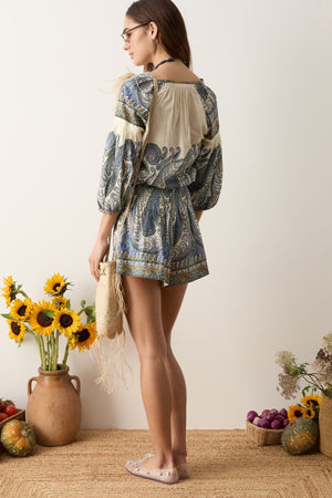 Arcadia Paisley is a luminous expression of BOTEH’s signature print handwriting. Set on a lemon-crème base and accented with pigment blue and olive, the paisley is engineered to create space and movement across the body. Crafted in breathable, organic linen, designed to move seamlessly from day to evening.