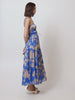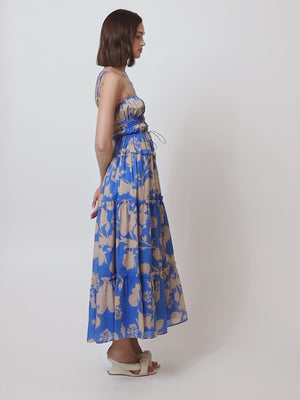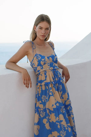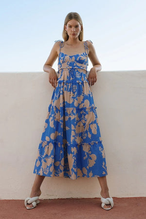Aurora is a large-scale tan florals on a cobalt blue base. The Aurora Strappy Midi Dress features a gathered bodice with ruching, adjustable waist drawcord tie complete with frill details.